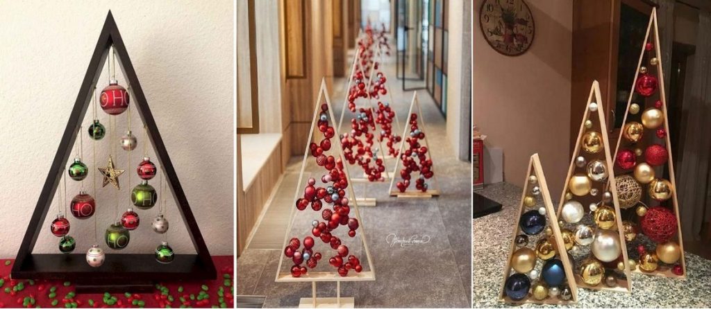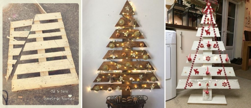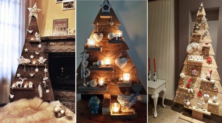 Möglicherweise haben Sie in Ihrer Garage alte Holzbretter, die Sie nicht mehr benötigen? Statt sie zu entsorgen, können Sie daraus einen originellen Weihnachtsbaum bauen. Dazu müssen Sie die Bretter einfach nur zu einer Dreiecksform zuschneiden, auf die Sie weitere Bretter anbringen, die als kleine Ablagen dienen, die Sie mit verschiedenen Weihnachtsdekorationen schmücken können – der Fantasie sind dabei keine Grenzen gesetzt.