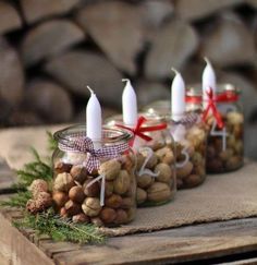 Ja, Sie haben richtig gelesen. Aus Gläsern – besser gesagt aus Einmachgläsern. Füllen Sie diese hierfür einfach zu ¼ mit Salz, Zucker, Reis, Nüssen oder anderen Deko-Steinen auf und legen darauf die Kerzen. Die Gläser können Sie außerdem mit Kunstschnee, Tannenzweigen, einer schönen Schnur oder einem Band verzieren.