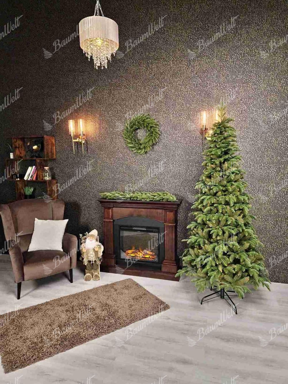 Er zeichnet sich durch seine schmale Form aus und ist daher ideal für beengte oder kleinere Räume. Der Baum hat einen raffinierten Stamm in einem natürlichen Braunton und ein Regenschirm-Klappsystem, das das Aufklappen erleichtert, so dass jeder Zweig an seinem Platz bleibt.