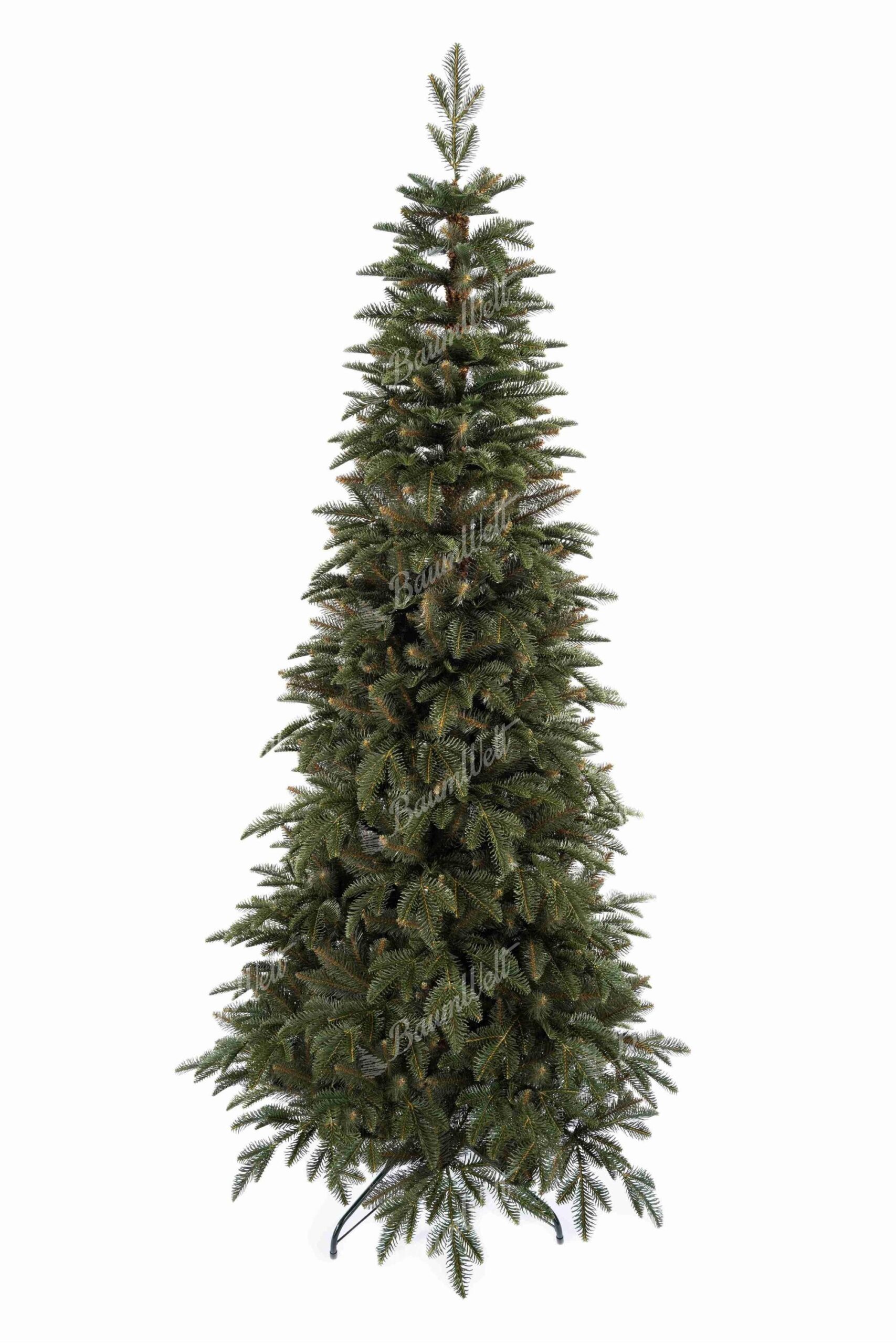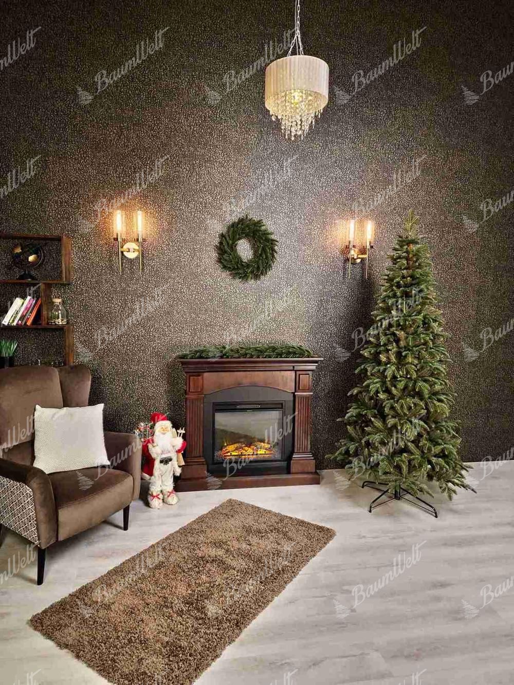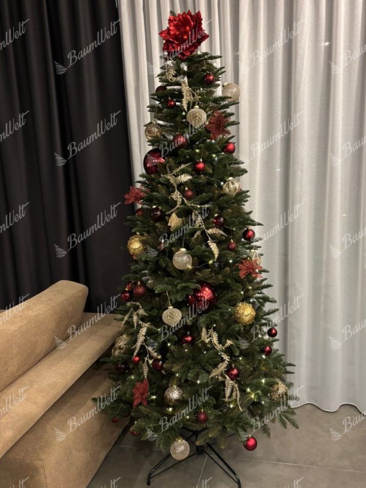 Er besticht durch seine schmale Form, die es ermöglicht, auch kleinere Räume zu schmücken. Um den Umfang des Baumes herum befinden sich realistische 3D-Tannenzweige und das Innere ist mit klassischen PVC-Nadeln vervollständigt, die den Baum noch dichter machen.