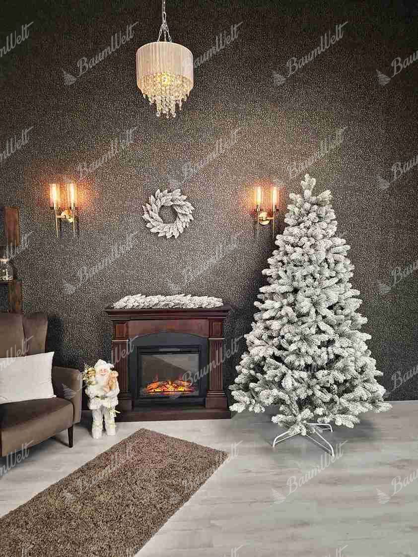 Die hochwertigen Tannenzweige des Baums sind dicht mit Kunstschnee bedeckt, was ihm ein realistisch verschneites Aussehen verleiht. Der Kunstschnee wird mit modernster Technologie nach und nach auf den gesamten Baum aufgetragen, so dass er nicht abfällt. Wenn die Zweige zum ersten Mal aufgeklappt werden, werden die nicht eingefangenen Teile des Schnees freigegeben.