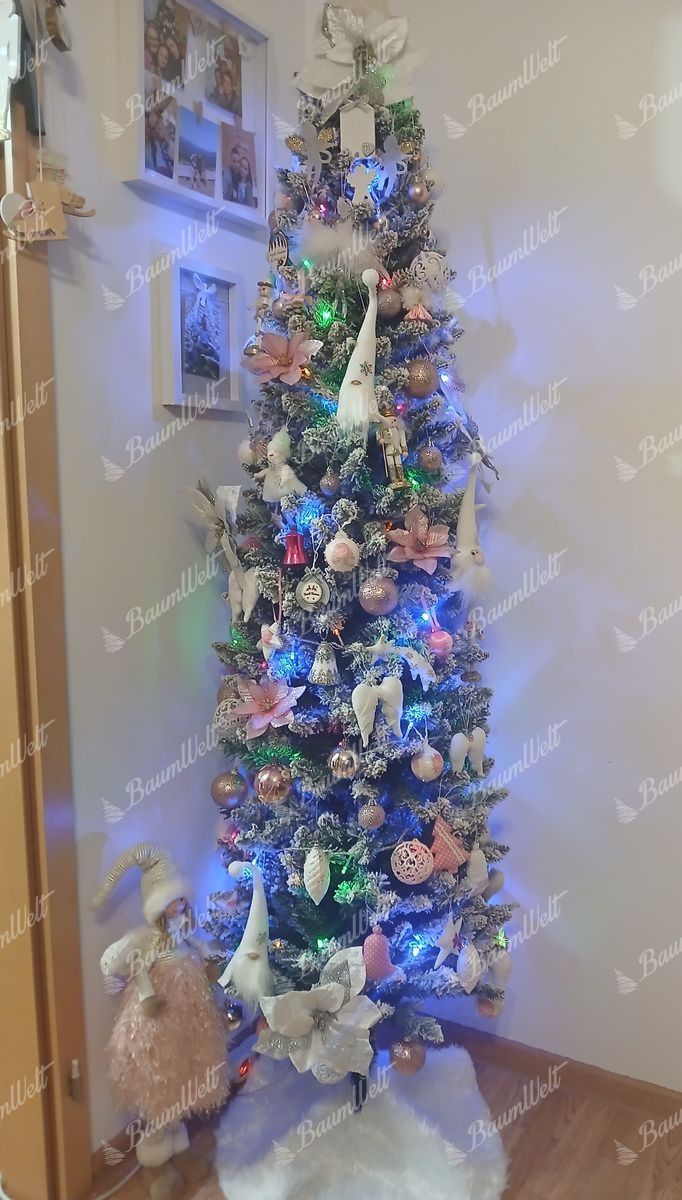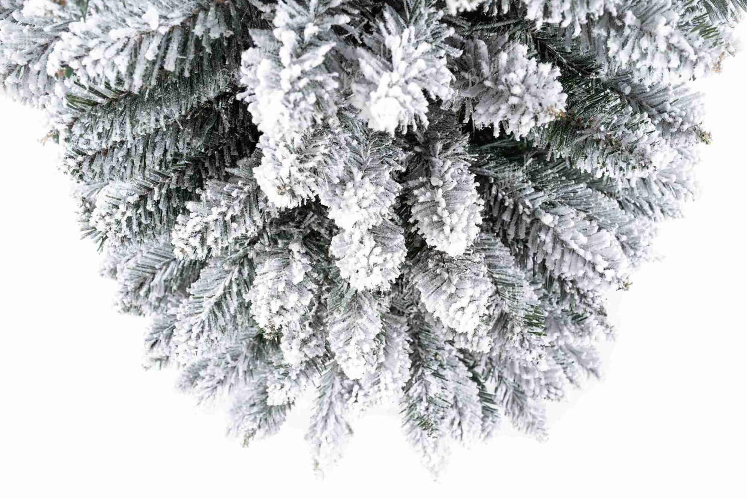Der Kunstschnee wird mit modernster Technologie aufgebracht und fällt nicht ab. Wenn der Baum zum ersten Mal aufgeklappt wird, können nicht eingefangene Teile des Schnees freigesetzt werden. Der Baum hat ein ausziehbares Faltsystem, eine Metallkonstruktion und einen stabilen Metallständer, der im Lieferumfang enthalten ist.
