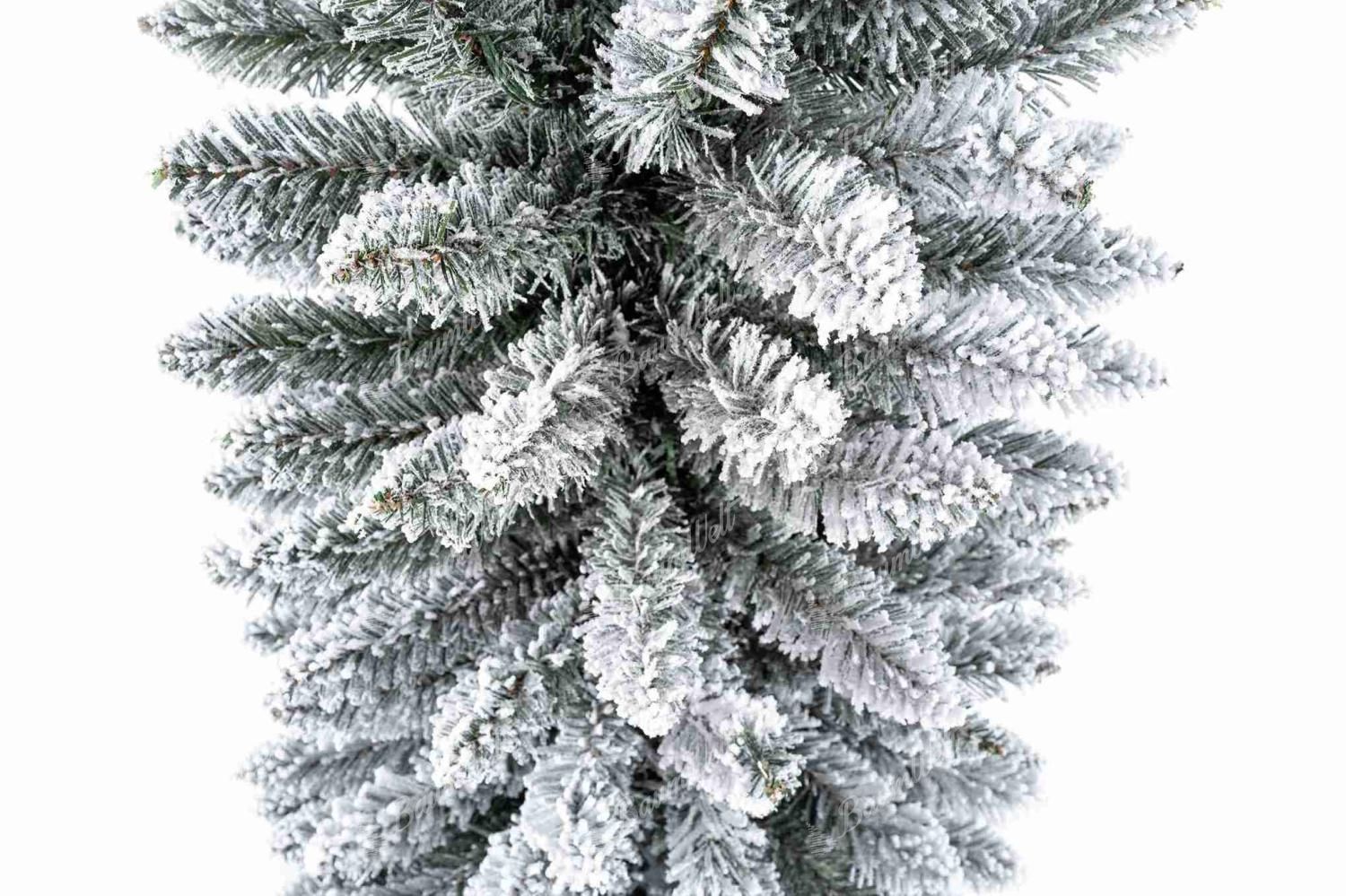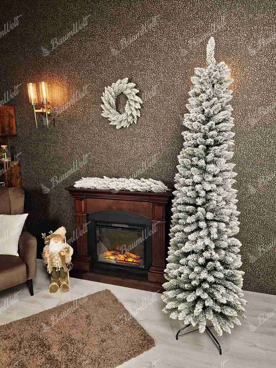 Die Neuigkeit für die Saison 2024: Der moderne, schneebedeckte Baum in der schmalen Version Weiß-Fichte Schmal zaubert dank der PVC-Fichtenzweige, die dicht mit realistischem Kunstschnee bedeckt sind, eine unvergessliche Schneestimmung.