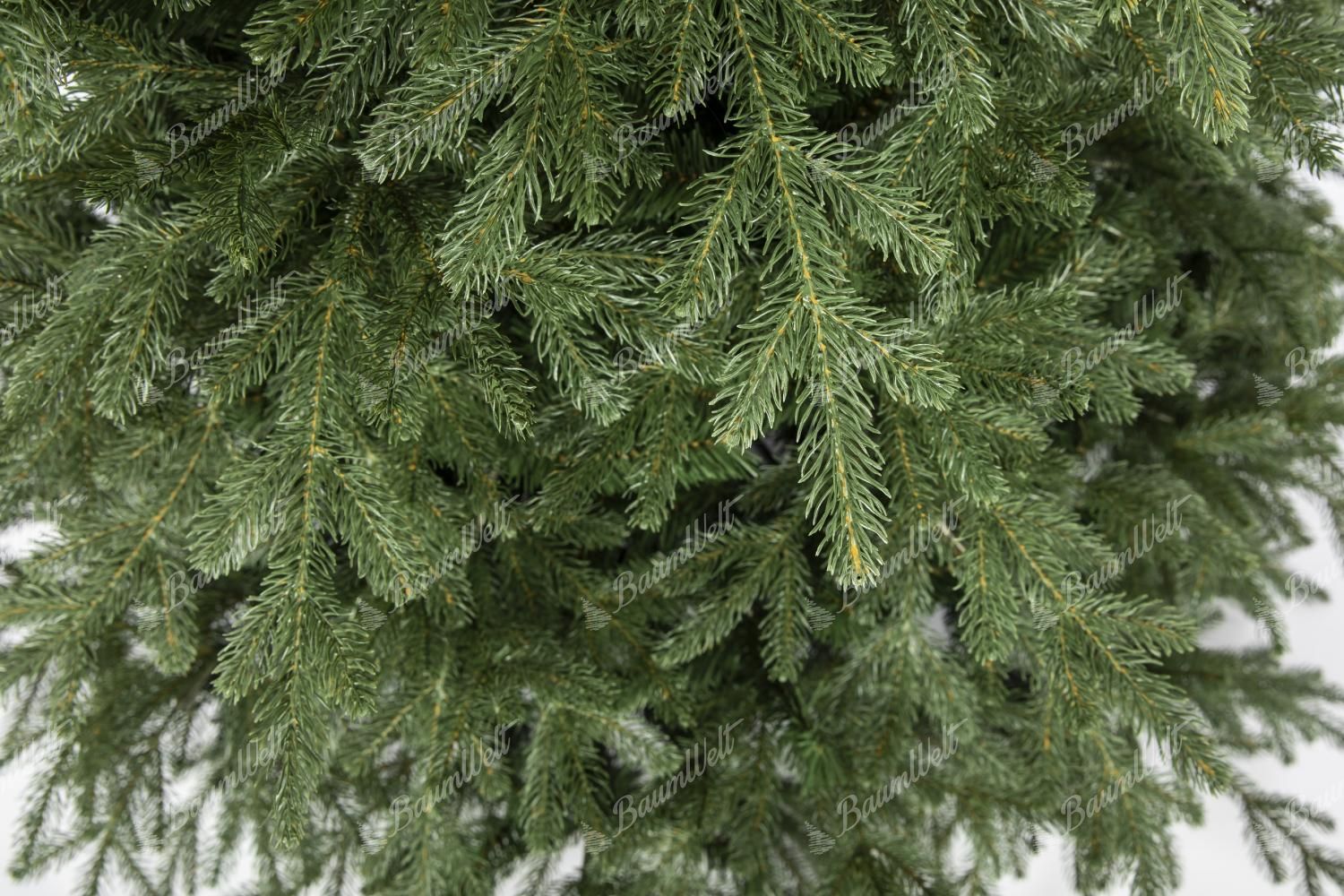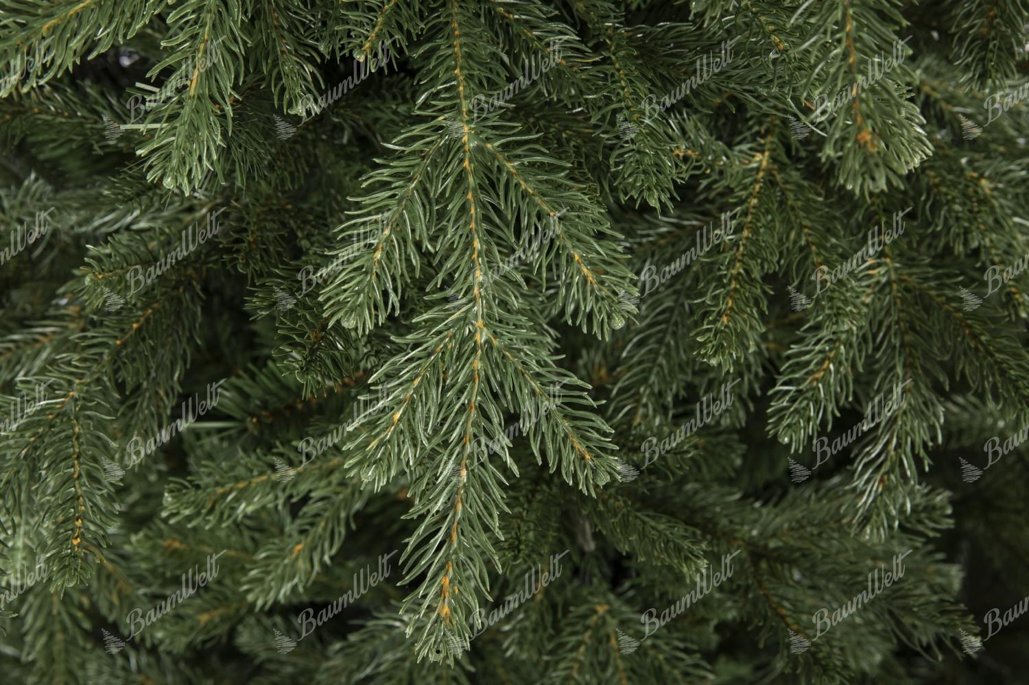Die dunkelgrünen Fichtenzweige sind perfekt um den gesamten Umfang des Baumes herum strukturiert. Die 3D-Nadel wird mit der neuesten und fortschrittlichsten Technologie hergestellt, um echten Zweigen perfekt zu ähneln. Bei der Herstellung unserer 3D-Zweige werden nur hochwertige PE-Materialien verwendet. Die Mitte des Baumes wird durch klassische PVC-Nadeln in gleicher dunkelgrüner Farbe ergänzt.