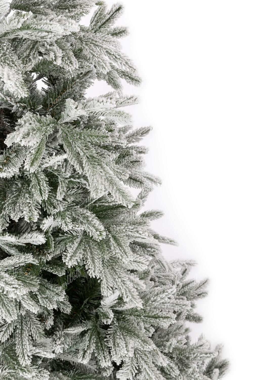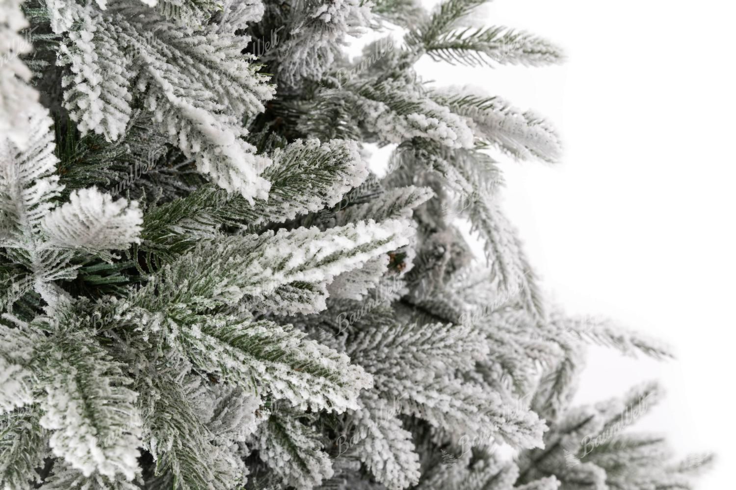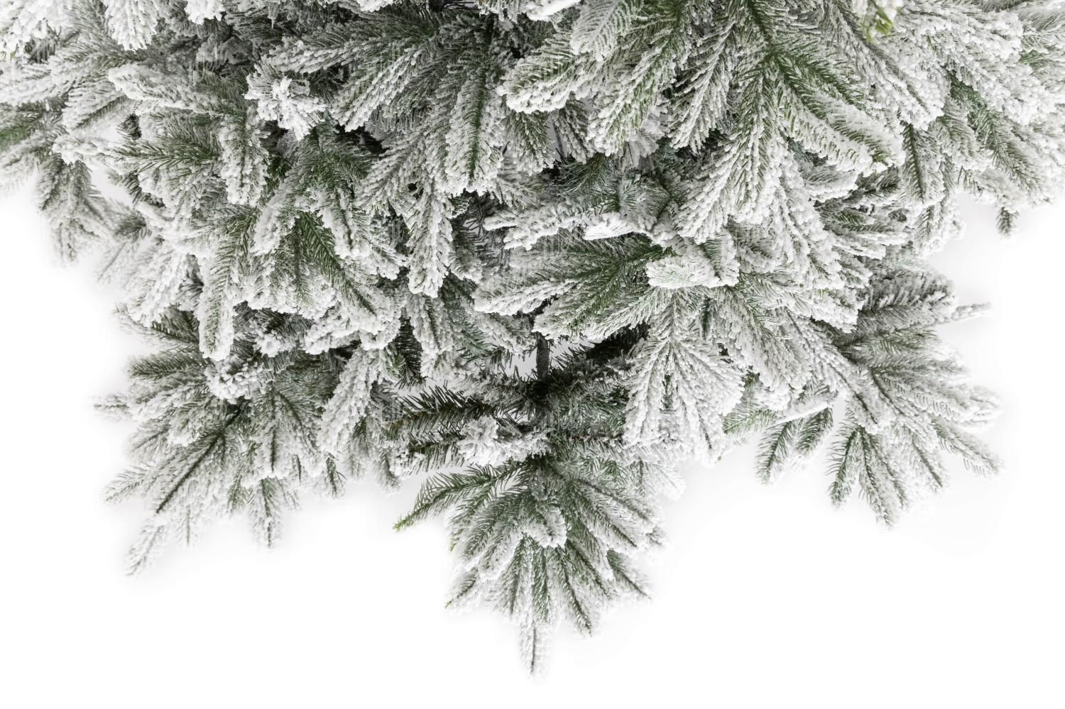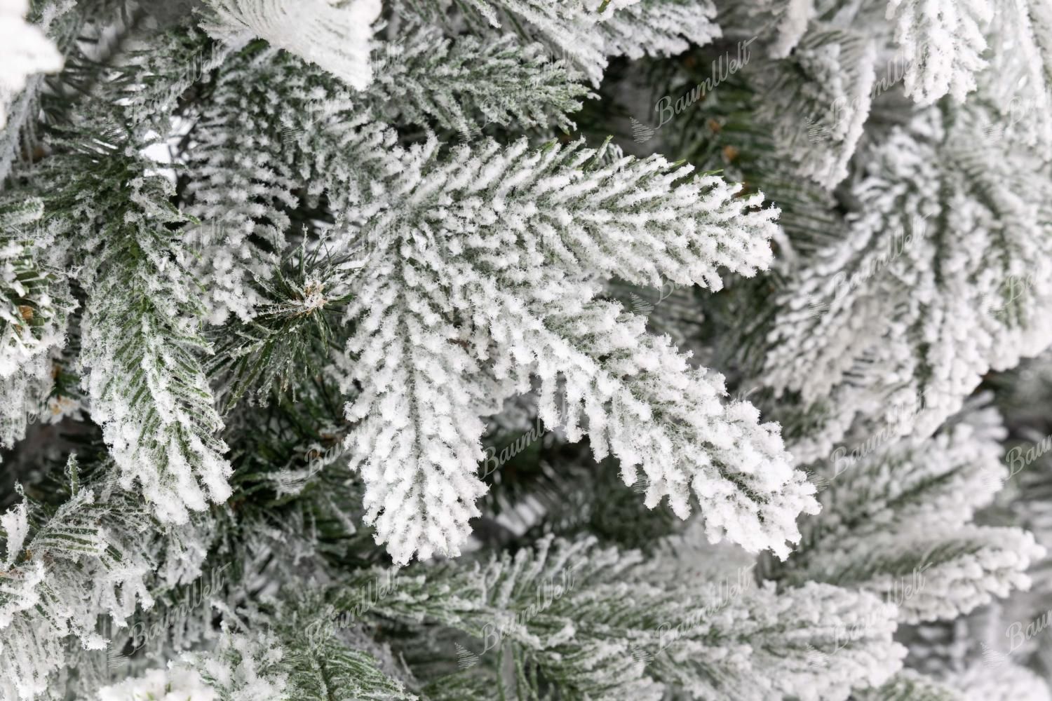Die realistische 3D Grönlandfichte hat hochwertige grüne Fichtennadeln, die mit einer Schicht Kunstschnee überzogen sind. Die 3D-Zweige rund um den Baum werden durch klassische PVC-Zweige ergänzt, die ebenfalls dicht mit Schnee bedeckt sind.