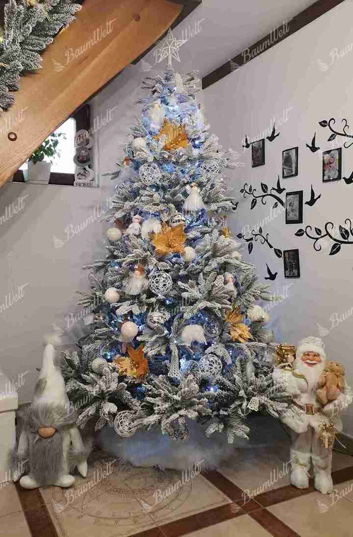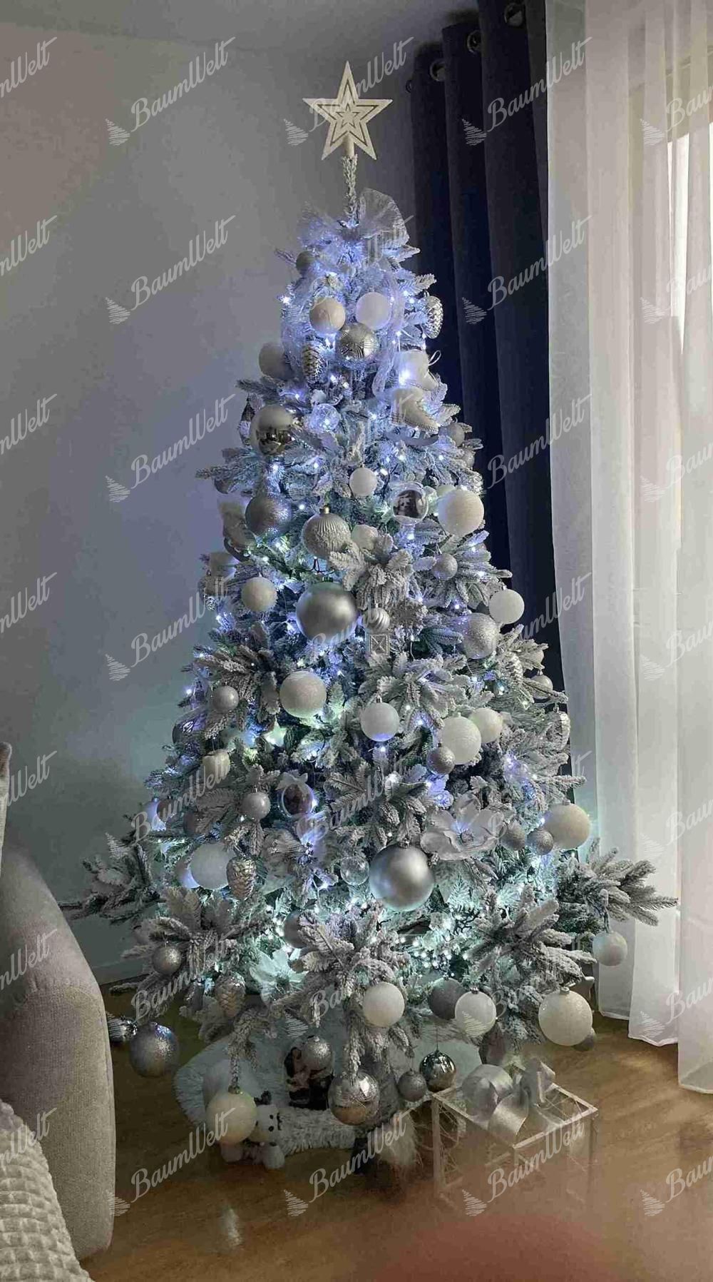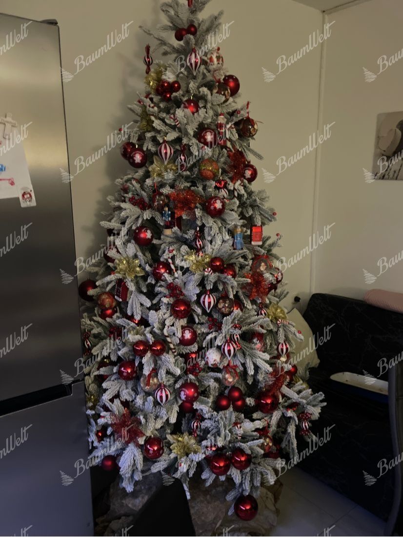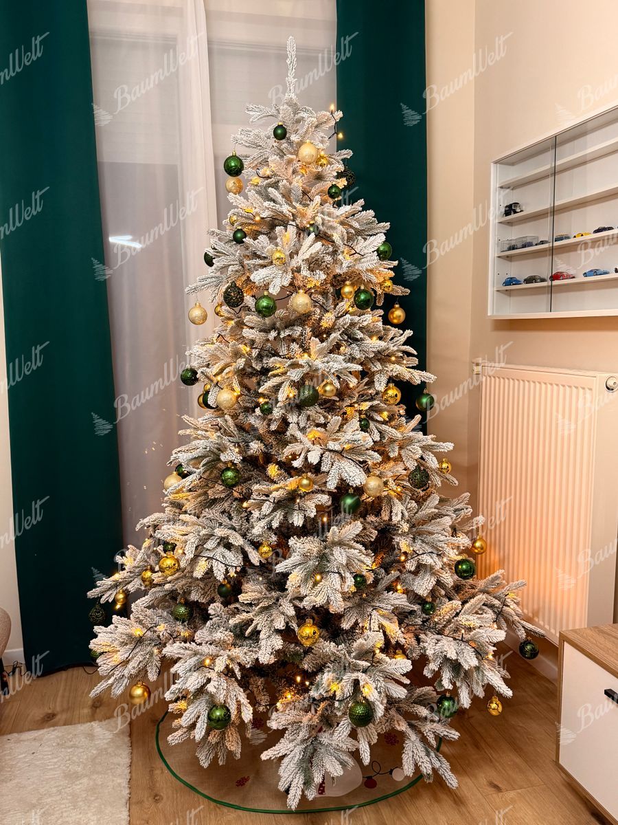 Die realistische 3D Grönlandfichte hat hochwertige grüne Fichtennadeln, die mit einer Schicht Kunstschnee überzogen sind. Die 3D-Zweige rund um den Baum werden durch klassische PVC-Zweige ergänzt, die ebenfalls dicht mit Schnee bedeckt sind.