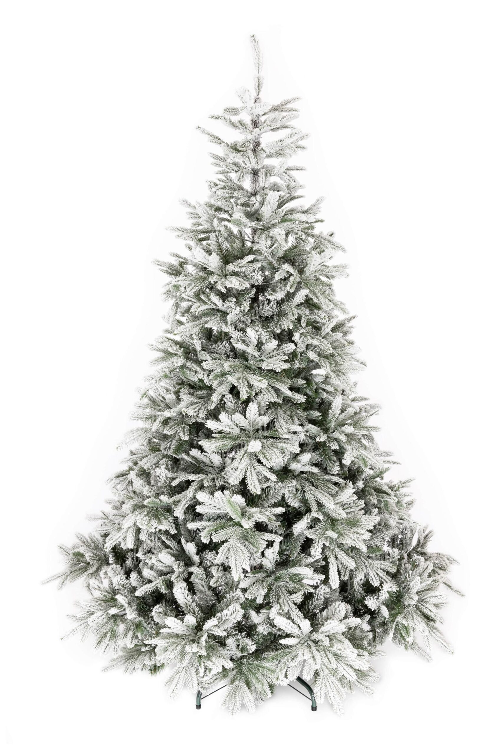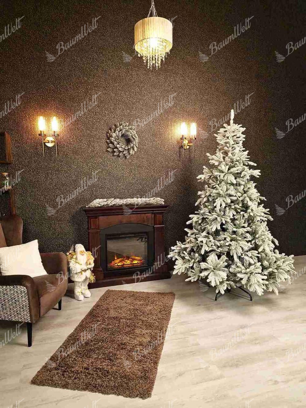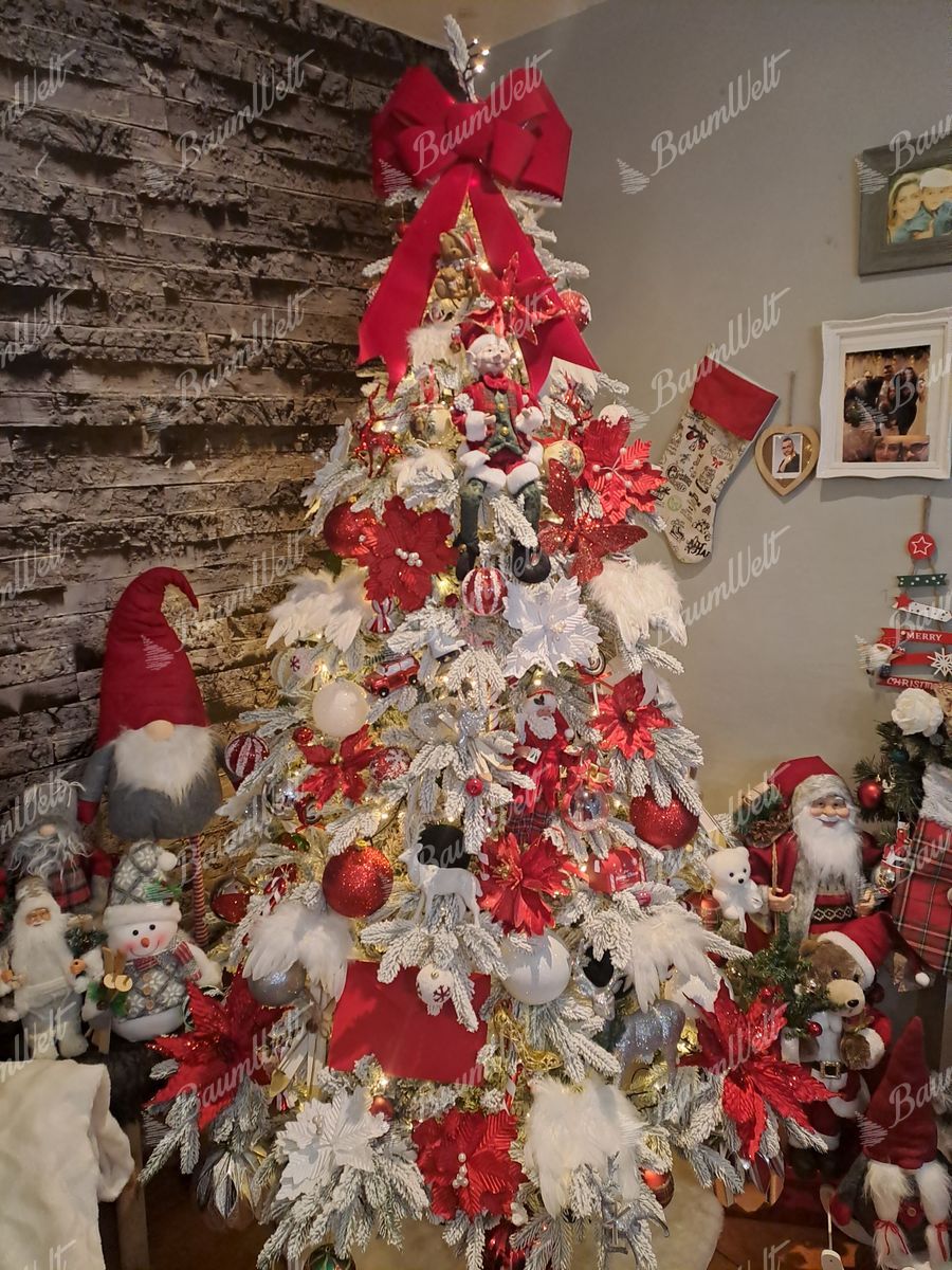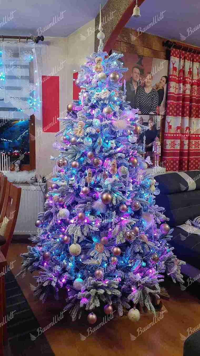 Die realistische 3D Grönlandfichte hat hochwertige grüne Fichtennadeln, die mit einer Schicht Kunstschnee überzogen sind. Die 3D-Zweige rund um den Baum werden durch klassische PVC-Zweige ergänzt, die ebenfalls dicht mit Schnee bedeckt sind.