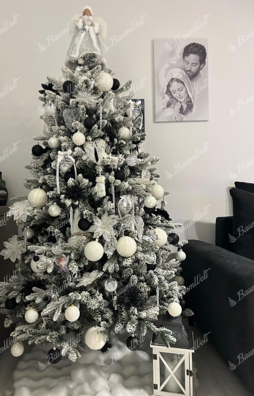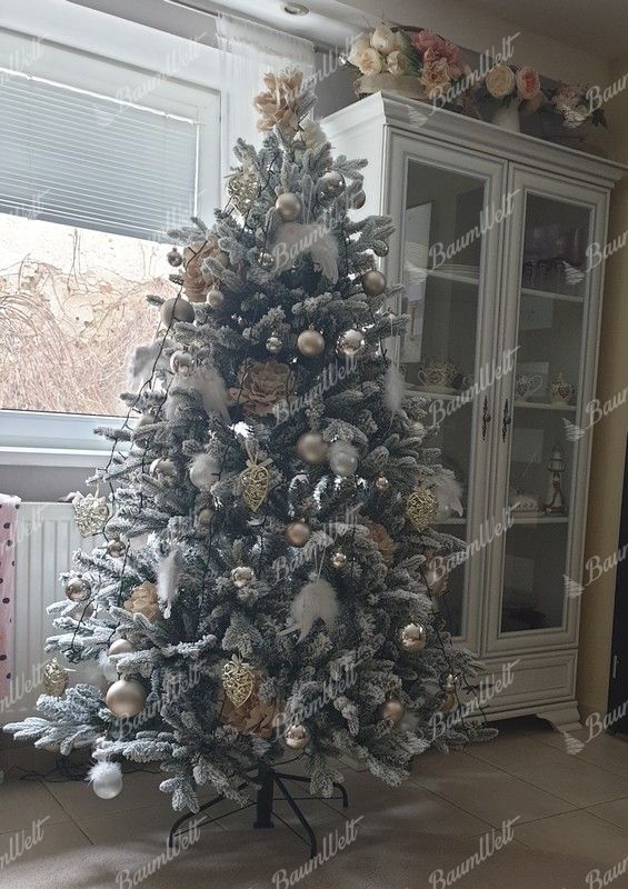 Die 3D-Nadeln um den gesamten Umfang des Baumes werden durch klassische PVC-Nadeln ergänzt, die dicht beschneit sind. Die moderne Applikation von dem Kunstschnee auf den Baum garantiert, dass der künstliche Schnee nicht abfällt. Der Baum besteht aus einer festen Eisenkonstruktion und ein stabiler Metallständer ist Bestandteil der Verpackung.