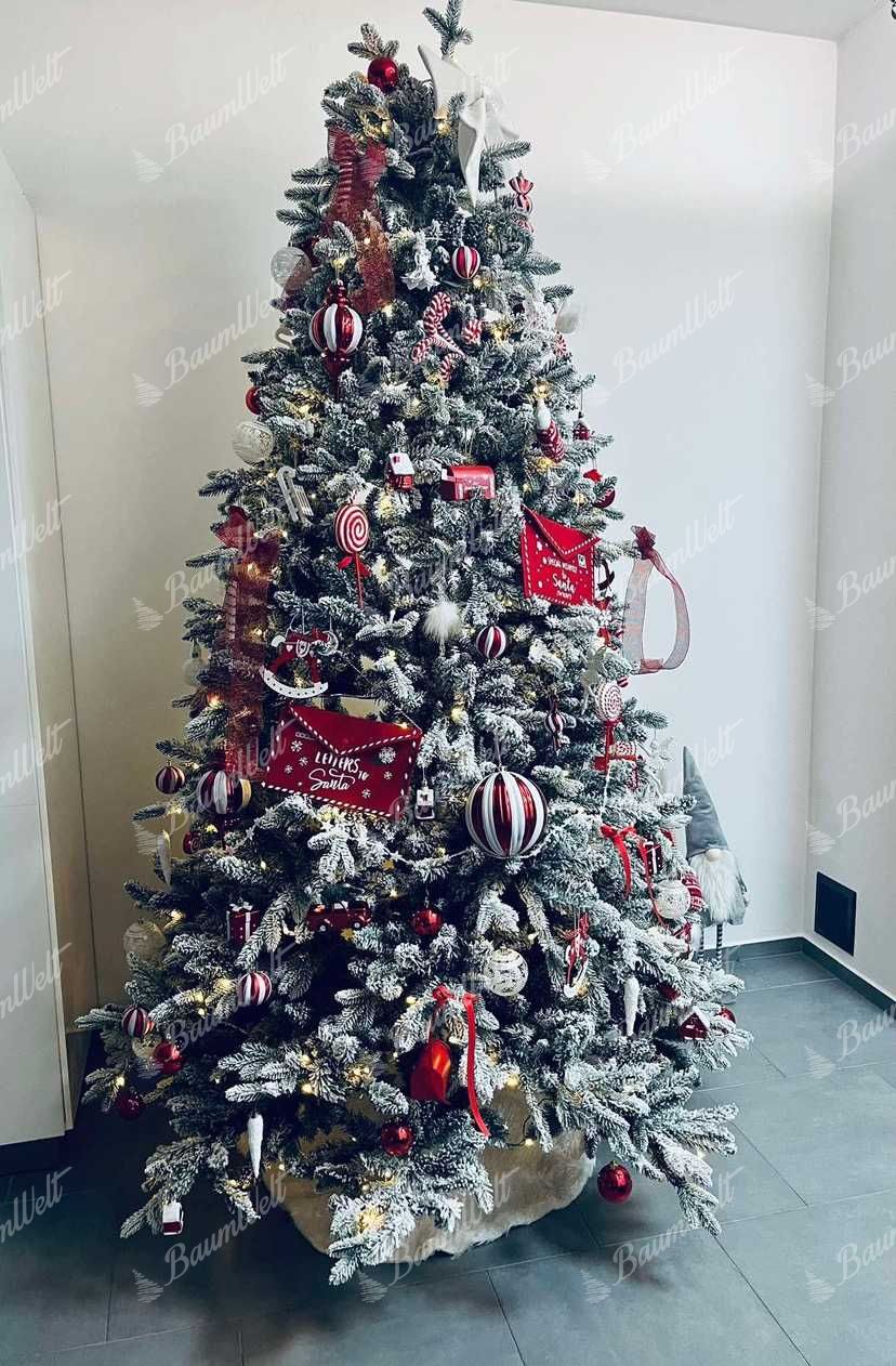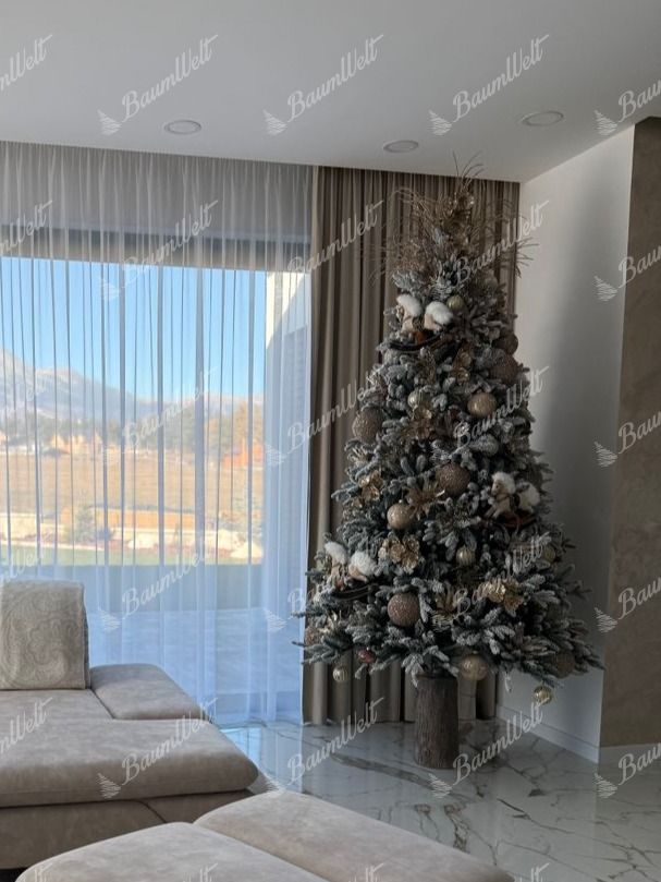 Die 3D-Zweige werden durch klassische PVC-Zweige, die mit Kunstschnee beschneit sind, ergänzt, wodurch der Baum dichter wirkt. Das neueste Anwendungssystem garantiert, dass kein Kunstschnee von den Bäumen fällt. Der Baum besteht aus einer festen, stabilen Eisenkonstruktion und wird mit einem Metallständer geliefert. Für die perfekte Form des Baumes sorgt ein Regenschirm-Faltsystem, das die einzelnen Zweige an eine vorbestimmte Stelle platziert.