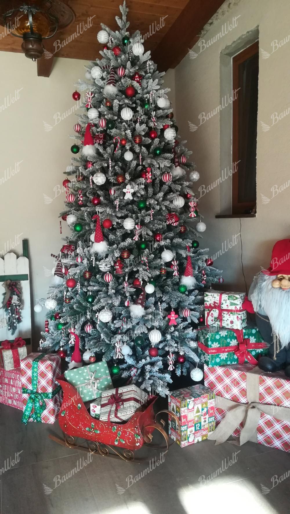 Das neueste Anwendungssystem garantiert, dass kein Kunstschnee von den Bäumen fällt. Der Baum besteht aus einer festen, stabilen Eisenkonstruktion und wird mit einem Metallständer geliefert. Für die perfekte Form des Baumes sorgt ein Regenschirm-Faltsystem, das die einzelnen Zweige an eine vorbestimmte Stelle platziert. Dieser Weihnachtsbaum verleiht Ihrem Zuhause die perfekte Winteratmosphäre.