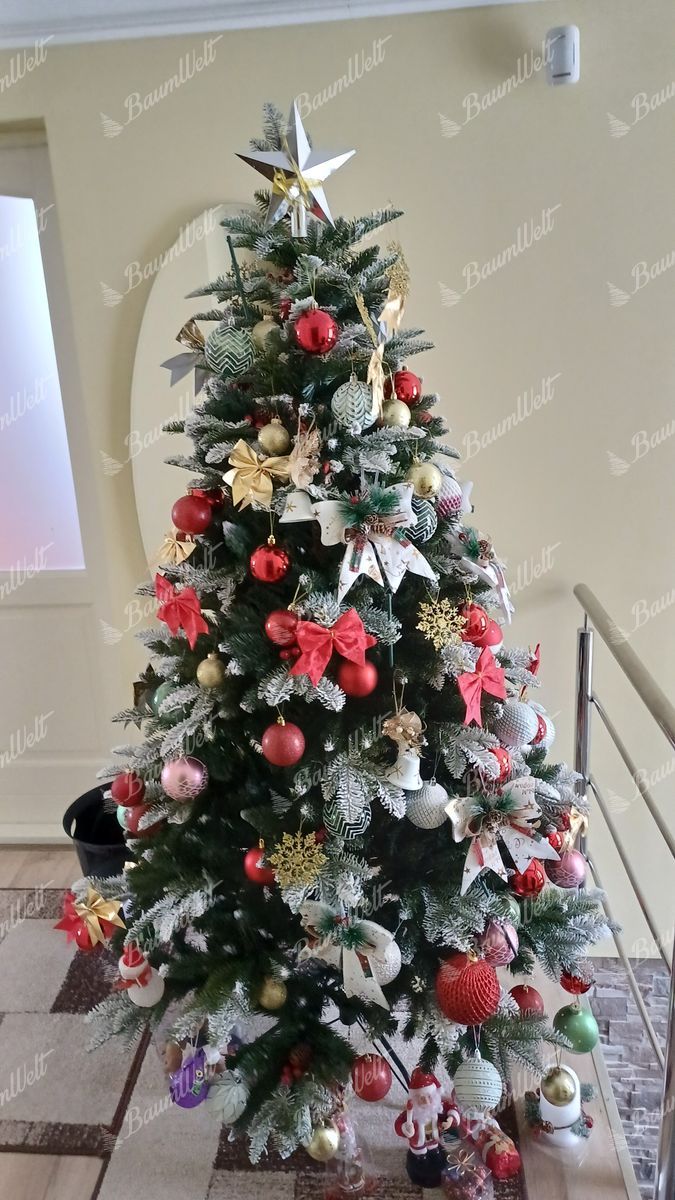 Künstlicher Weihnachtsbaum 3D Tanne mit Kunstschnee zeichnet sich durch dicht verschneite Zweige entlang den Rändern des gesamten Weihnachtsbaumes aus. Die 3D-Nadeln werden durch schneebedeckte Nadelbaumzapfen und Waldbeeren ergänzt, wodurch der Baum ein schönes, traditionelles Aussehen aufweist.