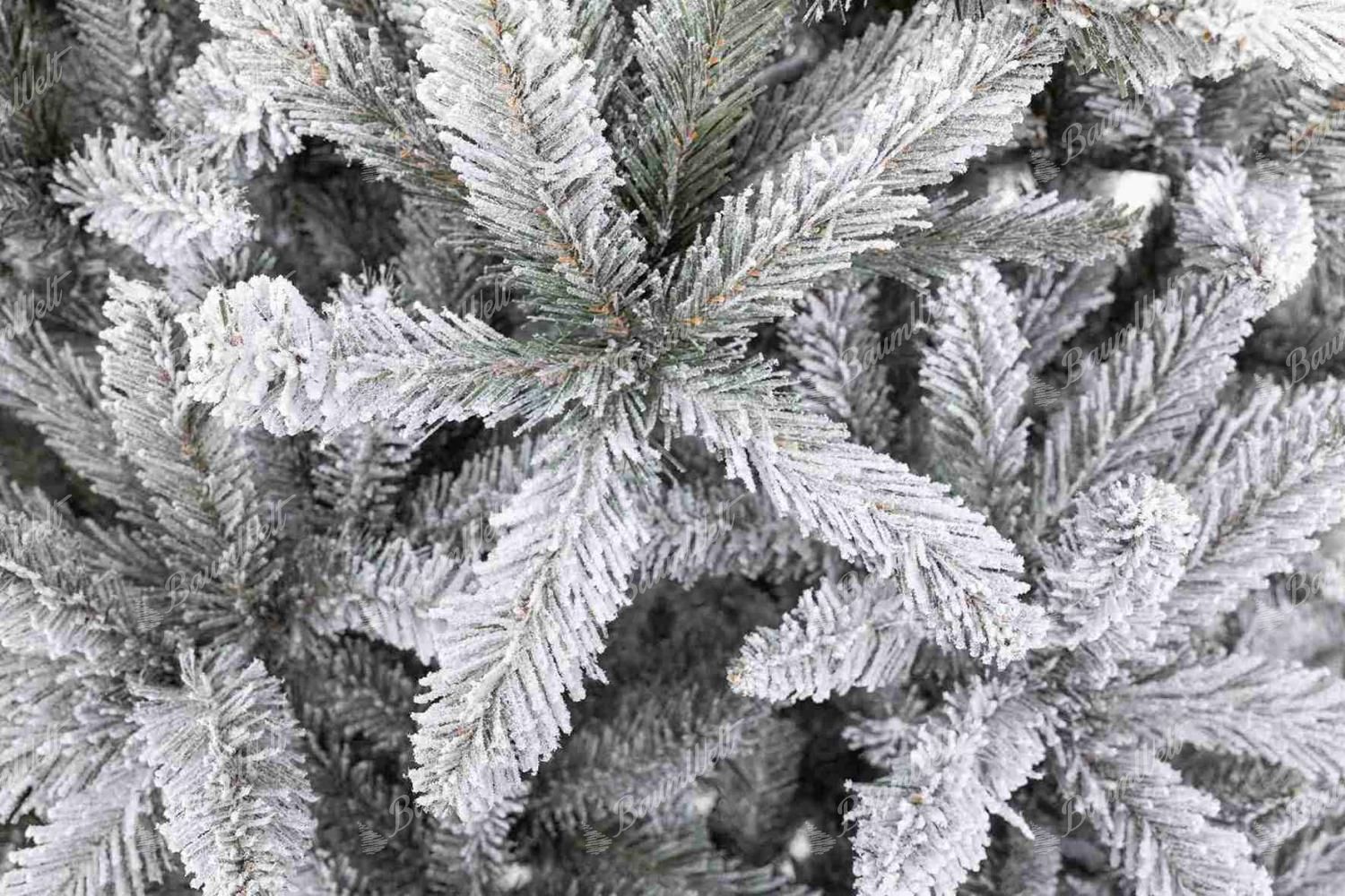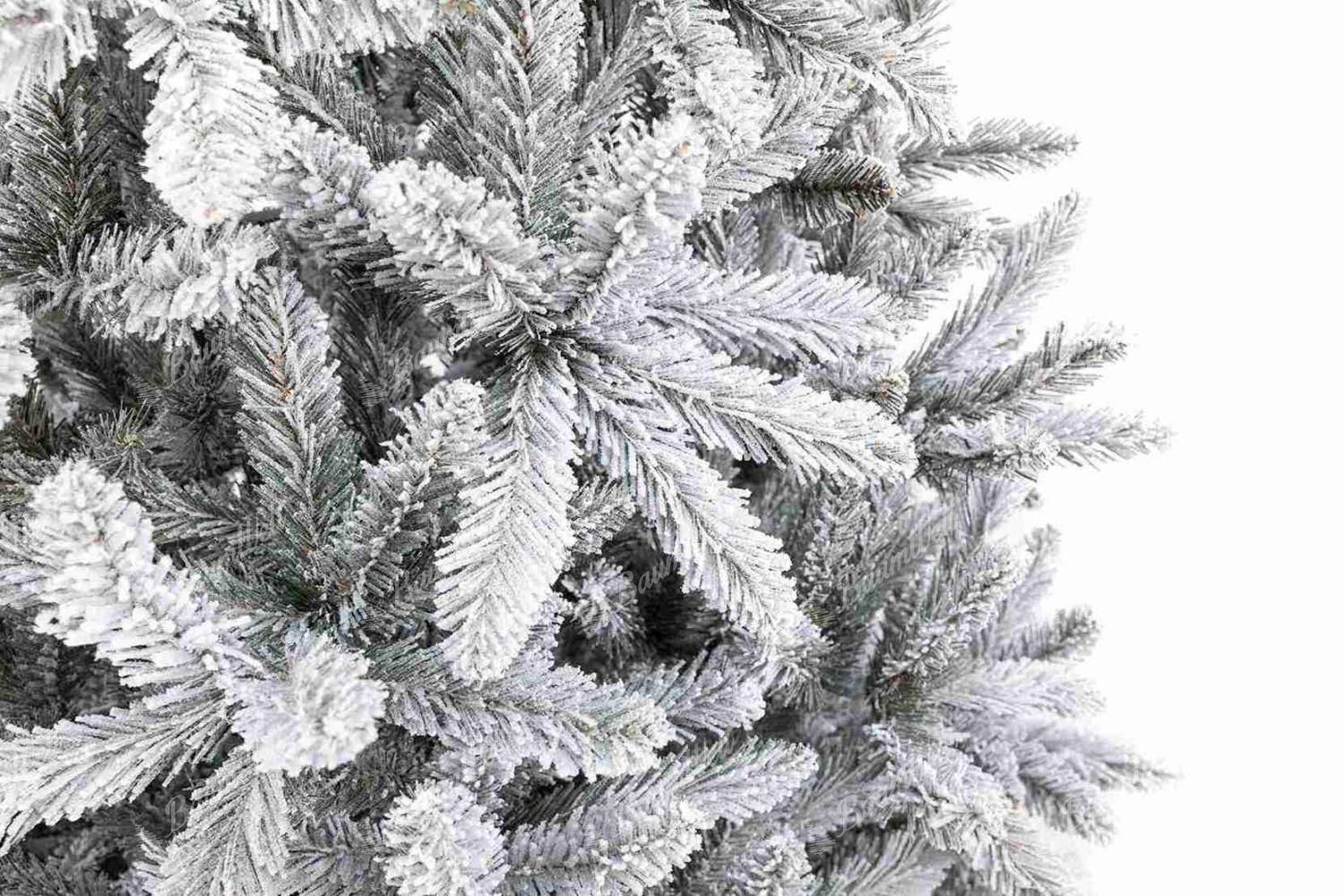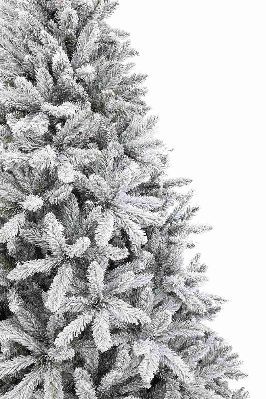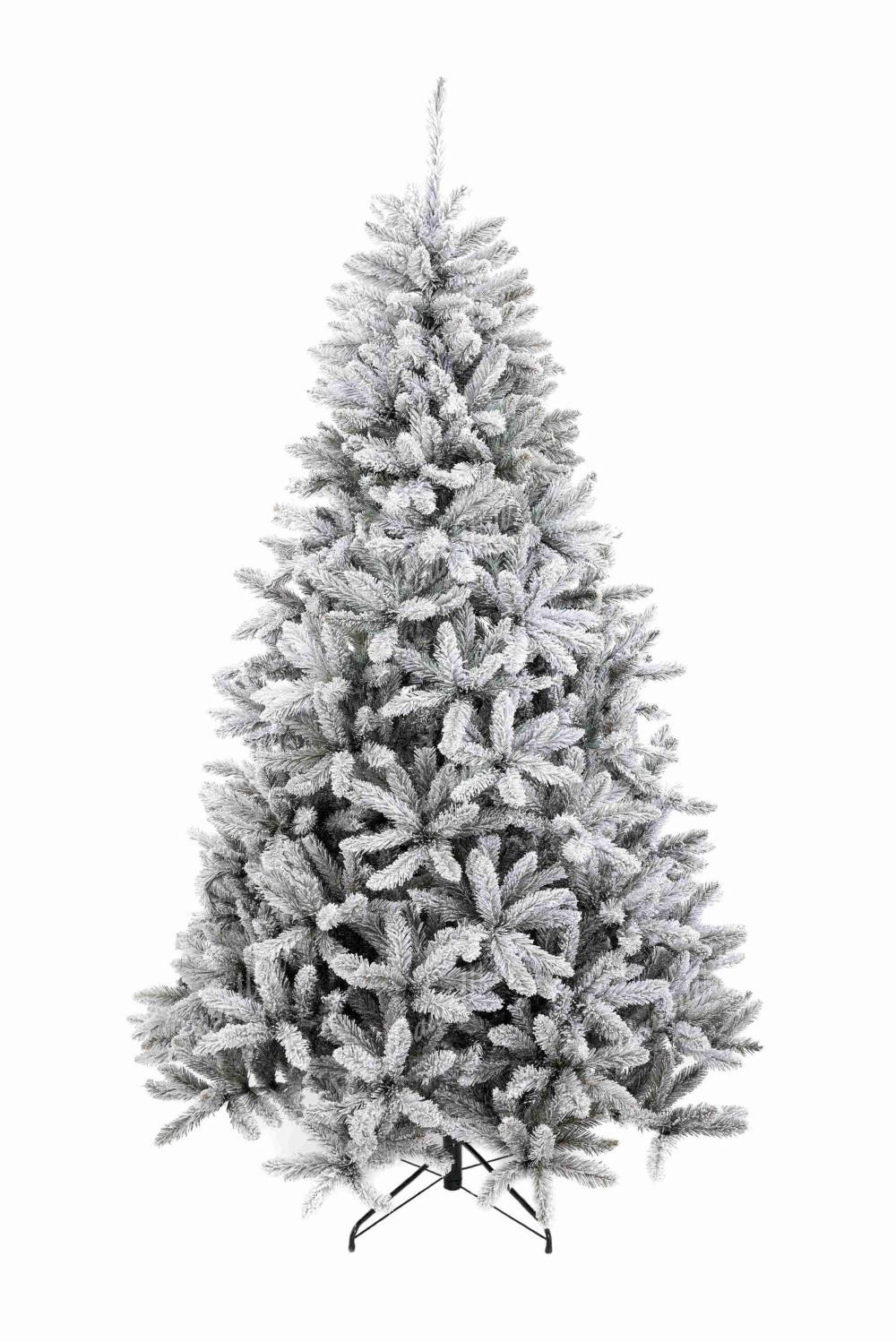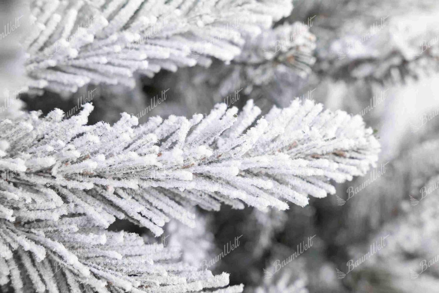 Der moderne, schneebedeckte künstliche Weihnachtsbaum Weiß-Fichte zeichnet sich durch hochwertige, grüne Fichtenzweige aus, die mit einer dicken Schicht der Kunstschnee bedeckt sind.