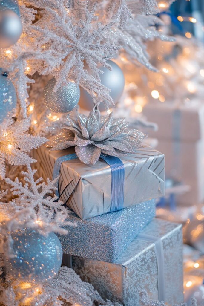 Hübsch verpackte Geschenke kommen unter einem realistischen 3D-Weihnachtsbaum besonders zur Geltung. Bei einem weißen oder verschneiten Baum entsteht ein perfekter Kontrast mit goldfarbenen, silbernen oder natürlichen Verpackungsstilen.