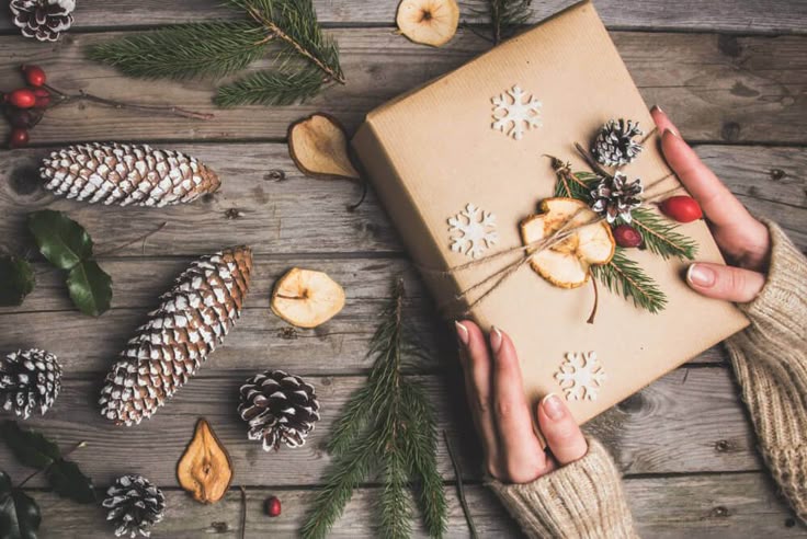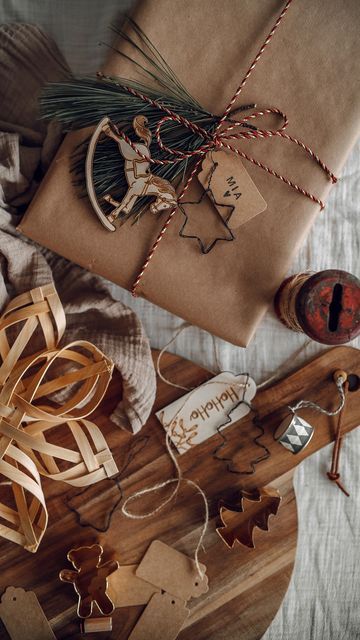 Die Basis ist einfaches braunes Kraftpapier. Es mag schlicht wirken, aber mit kleinen Details entsteht ein individueller Stil. Tannenzweige, Zapfen oder getrocknete Orangenscheiben und eine Schnur aus Jute verleihen dem Geschenk eine warme, natürliche Ausstrahlung.